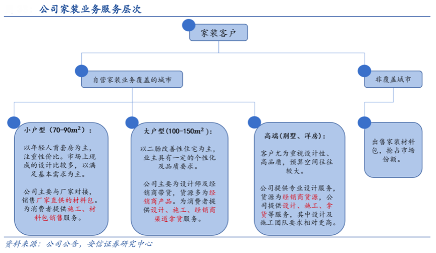 經典案例:根據公司公告、安信證券研究中心等綜合資訊表明,紅星美凱龍的家裝服務精準劃分客戶群,滿足消費者相應需求,主要以自營的家裝服務來滿足客戶需求,公司采用設計師及工程隊包工頭為內部人員,施工工人以外包形式獲得。目前公司家裝布局主要包括:提供全系列家裝服務的紅星·家倍得(成立于 2014 年)、紅星美凱龍網家裝平臺(成立于 2016 年),以及用于家裝設計的線上平臺——設計云。自 2019 年 下半年起,家裝業務進入快速發展階段,全年(集中在下半年)家裝業務合 同金額近 32 億元,實現銷售及家裝收入 5.69 億元,家裝服務獲得了大發展。