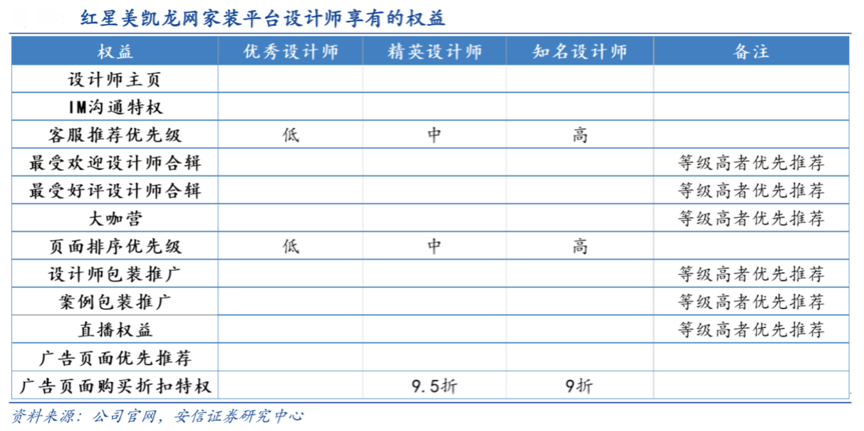 經典案例:根據公司官網、安信證券研究中心等綜合資訊表明,其推出了“設計家裝就一站”的紅星美凱龍網家裝平臺,其主要針對都市新中產的家裝需求,為客戶提供設計、施工、監理、選材、軟裝 等一條龍服務。平臺對入駐商戶進行考核,根據設計師的等級配套相應的優先級,包括客服推薦優先級、頁面排序優先級等。截至2018 年末,與公司的互聯網平臺簽約的高端家裝公司共計 2364 家,通過平臺預約裝修的客戶近 10 萬人。