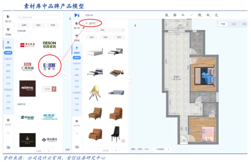 經典案例:根據公司官網、安信證券研究中心等綜合資訊表明,紅星美凱龍“設計云”提供全景式線上家裝設計服務,公司與“房天下”線上房地產家居專業網絡平臺達成合作,實現精 準營銷,提升轉化率。并在 2019 年 6 月,其推出了“1+N”模式的生態鏈平臺,以城市大家居體驗館、小區樣板間拎包入住、社區服務店的全場景滲透式服務形成精裝修“拎包入 住”業務的體系化服務,從開發商、設計、施工到服務體驗全流程滿足。