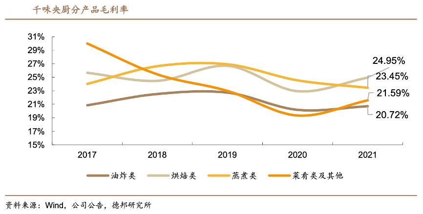 經(jīng)典案例:根據(jù)wind、公司公告、德邦研究所等綜合資訊表明, 2017-2021 年,千味央廚公司產(chǎn)品毛利率基本穩(wěn)定。公司的毛利主要來源于油炸類、烘焙類和蒸煮類產(chǎn)品。油炸類毛利率較為穩(wěn)定, 2021 年為 20.72%;蒸煮類系列產(chǎn)品毛利率相對較高,2021 年的毛利率為 23.45%。