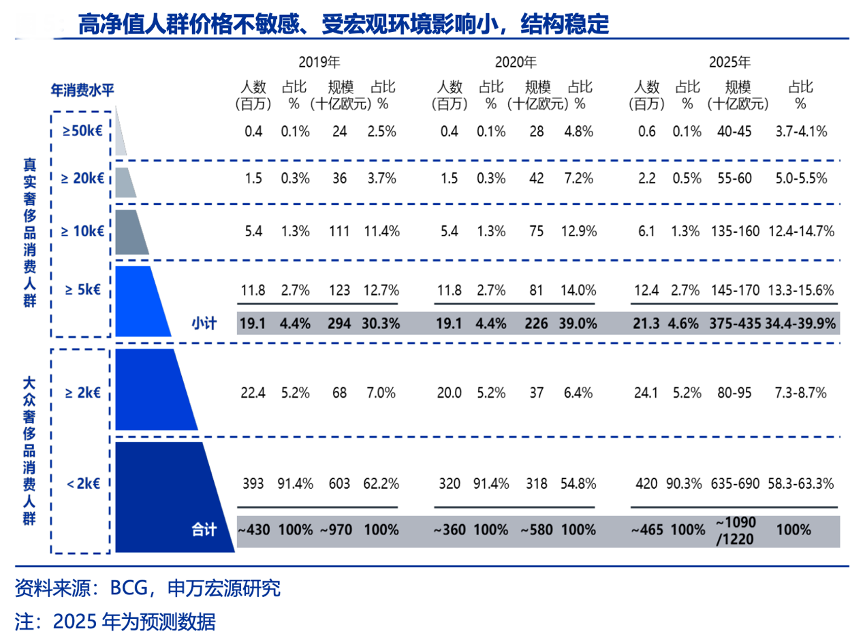經典案例:根據BCG、申萬宏源研究等綜合資訊表明,年消費金額在 5k 歐元以上的高凈值人群是奢侈品的購買主力,2020 年頭部 4%的客 群貢獻 39%的銷售收入。在 2020 年疫情影響下,年消費規模在 5000 歐元以上的客群規 模相對穩定,且消費水平在穩步提升。