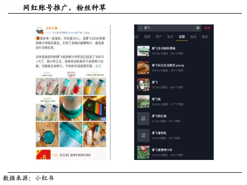 經(jīng)典案例:根據(jù)小紅書、國(guó)泰君安證券研究等綜合資訊表明,摩飛針對(duì)火鍋場(chǎng)景研發(fā)出具備多功能、社交需求的多功能鍋,恰好同時(shí)滿足大家居家吃火鍋的需求。2018年 Q3 開始做引流和促銷活動(dòng),同時(shí)差異化的產(chǎn)品設(shè)計(jì)更具備社交屬性,消費(fèi)者在朋友圈分享的頻次增加,2019年銷量已實(shí)現(xiàn)高增,成為小眾范圍內(nèi)爆品。