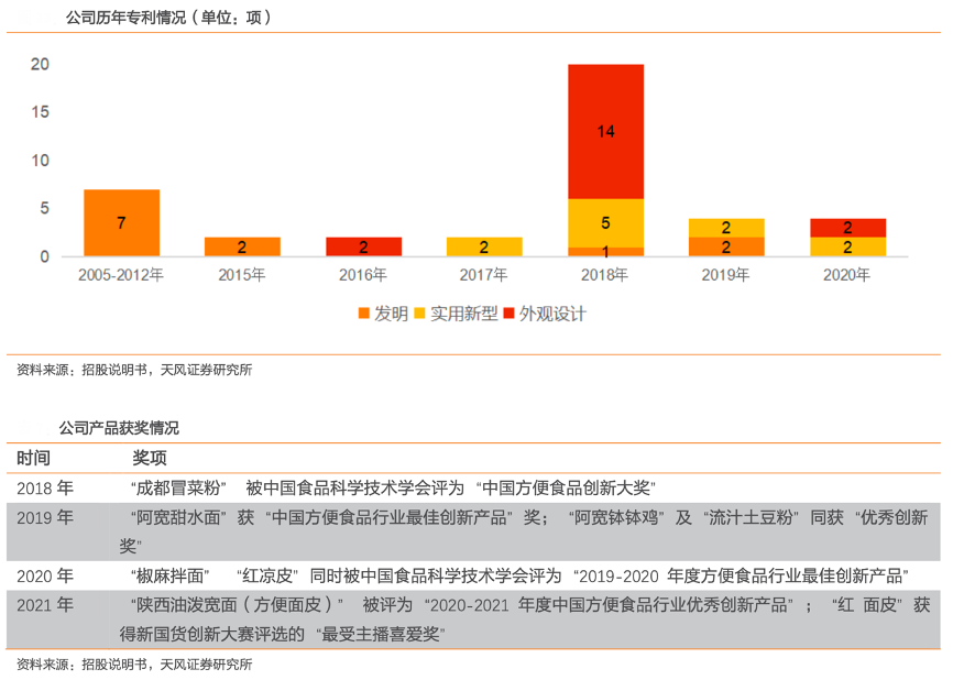 經典案例:根據招股說明書、天風證券研究所等綜合資訊表明,阿寬食品公司著力與生產設備廠家共同進行工藝設備的創新設計、研發與制造,開發出的全自動工業化生產新型工裝設備實現非油炸面皮和特色調味料包制作。目前,公司已經形成了多項技術專利成果,其中發明專利 12 項、實用新型專利 11 項,公司產品獲得多次獎項。其于2018年成功推出“紅油面皮”系列產品,2020年,該產品系列年銷售額約4億元,2021年榮獲新國貨創新大賽評選的“最受主播喜愛獎”。