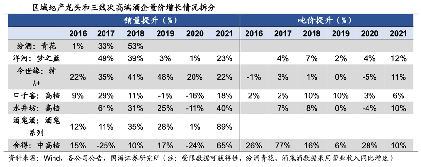 經典案例:根據wind、各公司公告、國海證券研究所等綜合資訊表明,2016年,劍南春、水井坊等整體定位300-500 元價位的品牌業績彈性開始顯現,區域次高端龍頭由于收入占比較小,對整體業績彈性貢獻較小,所以暫時沒有引起市場關注。2017年,三線次高端逐步開啟招商鋪貨全國化進程;下半年開始區域地產龍頭次高端價位開始自主放量。2018年酒企開始主動培育次高端產品后,三線次高端和區域龍頭的次高端產品銷量均有較快增長。