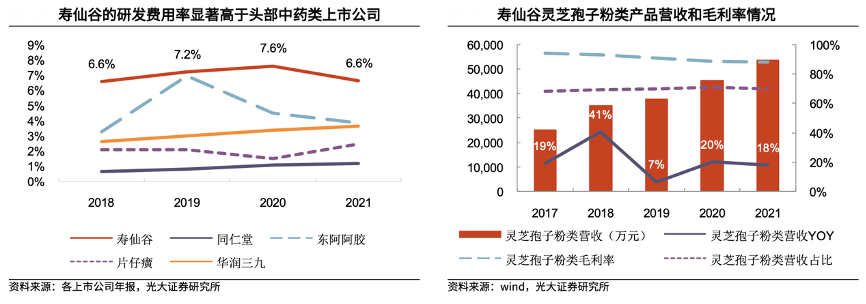 經典案例:根據各上市公司年報、wind、光大證券研究所等綜合資訊表明,壽仙谷公司靈芝孢子粉類產品營收穩健增長,毛利率保持高位。其靈芝孢子粉系列產品占公司總營收的70%左右,2017-2021 年該產品營收復合增速為20.9%。