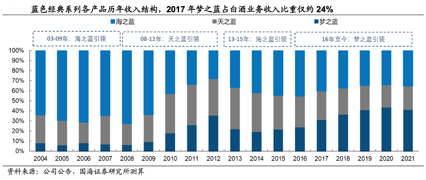 經(jīng)典案例:根據(jù)公司公告、國海證券研究所等綜合資訊表明,2003年洋河公司主推的“海之藍(lán)”精準(zhǔn)卡位當(dāng)時(shí)市場上幾無競品的 138 元價(jià)格帶,結(jié)合品牌以及渠道端的創(chuàng)新,海之藍(lán)迅速完成泛全國化,2004-2006 年收入復(fù)合增速約 00%,成為百元價(jià)格帶最大的單品,2017年海/天系列合計(jì)銷售達(dá)百億,公司 300 元以下產(chǎn)品收入占比超75%。