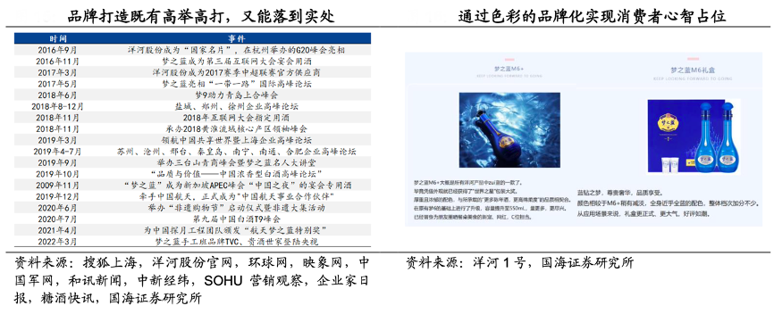 經(jīng)典案例:根據(jù)搜狐上海、洋河股份官網(wǎng)、環(huán)球網(wǎng)、映象網(wǎng)、中國軍網(wǎng)、和訊新聞、中新經(jīng)緯、SOHU營銷觀察、企業(yè)家日報(bào)、糖酒快訊、洋河1號、國海證券研究所等綜合資訊表明,洋河公司前期通過營銷已經(jīng)順利完成“藍(lán)色經(jīng)典”、“夢之藍(lán)”的品牌全國化,通過色彩營銷完成 “占位”,把藍(lán)色與公司品牌畫上等號,更以“雙名酒”形成難以超越的形象財(cái)富。