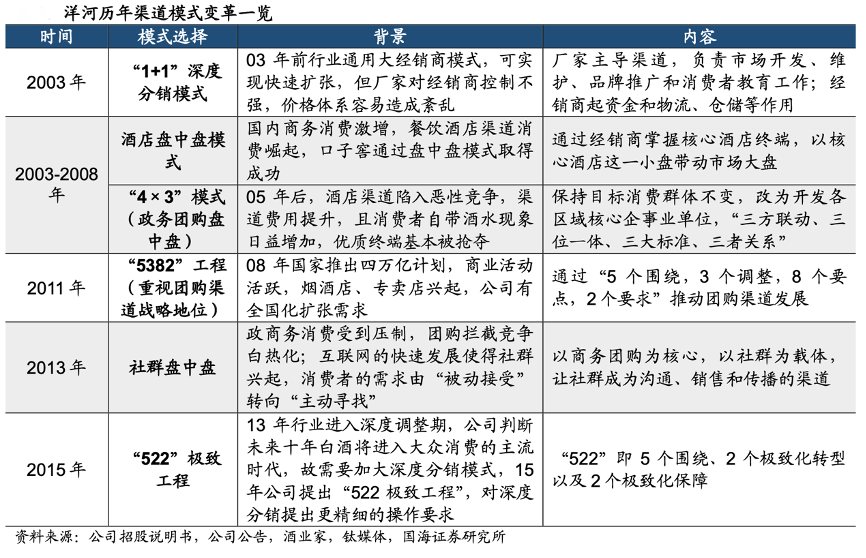 經典案例:根據公司招股說明書、公司公告、酒業家、鈦媒體、國海證券研究所等綜合資訊表明,洋河渠道端采取深度分銷、“消費者盤中盤”等模式,并隨行業的發展不斷迭代渠道營銷方式,公司首次將快消品深度分銷的概念引入白酒渠道,陸續推出酒店盤中盤、“4×3”、“5382”工程和“522”極致工程等營銷方式,之后公司走出江蘇,基本實現泛全國化,2015 年省外營收占比即提升至約 40%。