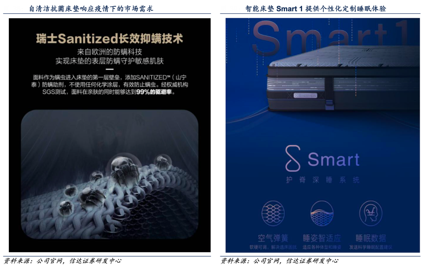 經(jīng)典案例:根據(jù)公司官網(wǎng)、信達證券研發(fā)中心等綜合資訊表明,喜臨門公司對現(xiàn)有產(chǎn)品系列“凈眠”、“法詩曼”、“可尚”、“喜眠”、“愛爾娜”等進行全面升級,其積極布局智能產(chǎn)品,發(fā)布全新智能床墊 Smart 1,構(gòu)建完整的智能睡眠產(chǎn)品體系,C端對接華為智慧生活平臺,B端跟涂鴉和華住簽訂戰(zhàn)略合作協(xié)議,共同孵化智能睡眠市場。