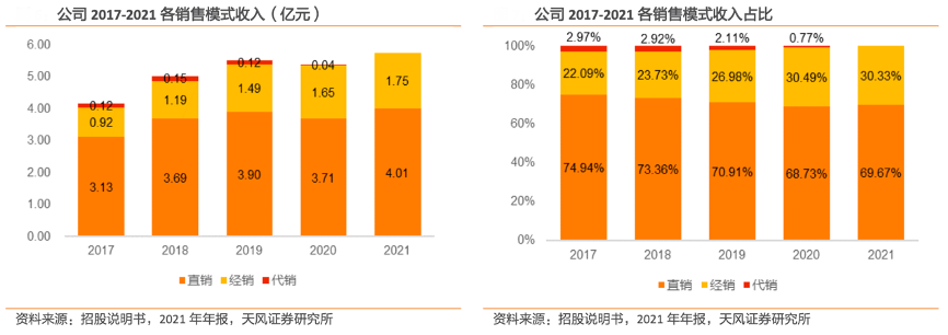 經典案例:根據各公司官網、雙好眼鏡網、億視麗眼鏡網、天風證券研究所等綜合資訊表明,分銷售模式看,明月鏡片公司以直銷為主、經銷為輔,直銷業務模式下包括自有品牌、非自有品牌鏡片、鏡片原料、鏡架和成鏡等眼視 光類產品,2017-2021 收入分別為 3.13/3.69/3.90/3.71/4.01 億元,占主營業務比約 70%左右,其中 20/21 年直銷模式中直營電商收入分別為 0.46/0.53 億元,占主營業務比為 8.47%/9.19%;公司僅與湖南光合作用合作代銷貼牌鏡片,由于公司全面推行“明月鏡片”品牌戰略,代銷貼牌鏡片業務體量顯著下降。