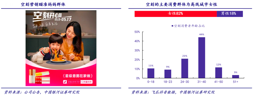 經典案例:根據公司公告、飛瓜抖音數據、中國銀河證券研究院等綜合資訊表明,西餐大眾化背景下,高線城市女性群體最愿意嘗鮮,空刻以高線城市女性群體為突破口,消費場景綁定品質、燭光晚餐、輕奢屬性等關鍵詞,做到消費群體與消費場景的較好融合。同時速食意面在家庭端的滲透率加速提升,公司產品“空刻”意面品質優秀,能夠較大程度還原餐廳口味,分享到行業增長的紅利。