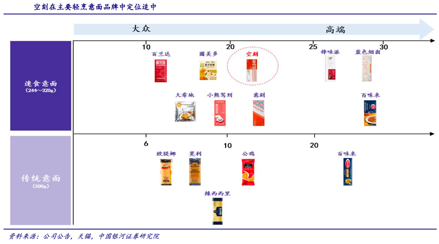 經典案例:根據公司公告、飛瓜抖音數據、中國銀河證券研究院等綜合資訊表明,空刻屬于定位中高端的新消費品牌,線上售價約 20 元/份,在類似新消費品牌中具備較強性價比,亦低于 B 端西餐廳意面的平均客單價(30 元以上)。