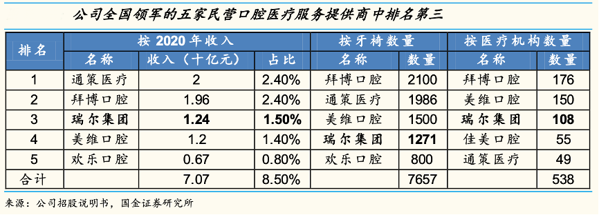 經(jīng)典案例:根據(jù)弗若斯特沙利文、國金證券研究所等綜合資訊表明,瑞爾集團公司在全國領(lǐng)軍的五家民營口腔醫(yī)療服務(wù)提供商中排名第三。從收入、各 地區(qū)的口腔醫(yī)療機構(gòu)數(shù)目及市場參與者的牙科椅數(shù)目三方面評估,截至2020 年 3 月 31 日,公司在全國領(lǐng)軍的五家民營口腔醫(yī)療服務(wù)提供商中排名第三。