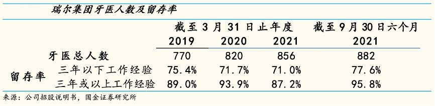 經(jīng)典案例:根據(jù)公司招股說明書、國金證券研究所等綜合資訊表明,瑞爾集團公司與北京大學(xué)口腔醫(yī)學(xué)院、四川大學(xué)華西口腔醫(yī)學(xué)院等一流口腔醫(yī)學(xué)院保持長期合作關(guān)系,從校園招聘中獲得優(yōu)秀畢業(yè)生;同時,公司主要從公立醫(yī)院招聘資深牙醫(yī)。與公司雇傭關(guān)系超過五年、十年以及十五年的牙醫(yī)占醫(yī)生總數(shù)的 31.9%、11.2%和 4.8%。
