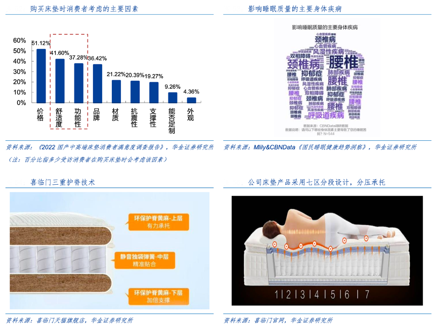 經典案例:根據《2022國產中高端床墊消費者滿意度調查報告》、Mlily&CBNData《國民睡眠健康趨勢洞察》、喜臨門天貓旗艦店、喜臨門官網、華金證券研究所等綜合資訊表明,喜臨門自 2013 年起,連續十年發布《喜臨門睡眠指數報告》,構建以中國人睡眠狀況 為研究對象的專業指標體系,堅持國人睡眠研究和消費者洞察。公司床墊產品以“保護脊椎”為核心功能訴求,不斷深化“保護脊椎”和“深度好睡眠”的品牌定位,喜臨門護脊床墊產品榮獲香港脊醫協會認證,“護脊之星”等榮譽。
