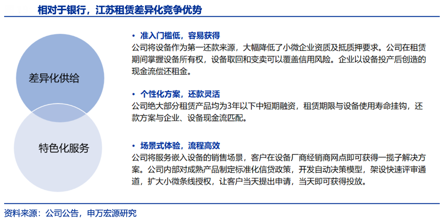 經典案例:根據公司公告、申萬宏源研究等綜合資訊表明,江蘇租賃公司差異化定位于中小客戶,其在準入門檻、還款方案、申請流程上培育起相對于銀行的競爭優勢:1)準門檻低,不需要抵質押物;2)還款方案個性化,與企業現金流匹配;3)流程高效,中小企業在銀行等金融機構貸款流程周期長,而江蘇租賃最快當天就可獲得投放。