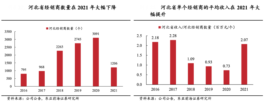 經(jīng)典案例:根據(jù)公司公告、東亞前海證券研究所等綜合資訊表明,老白干于2021年進(jìn)一步優(yōu)化營銷網(wǎng)絡(luò)布局,與整體實(shí)力較雄厚的經(jīng)銷商合作,加強(qiáng)對于經(jīng)銷商的業(yè)績考核,推進(jìn)經(jīng)銷商的優(yōu)勝劣汰。從數(shù)據(jù)上來看,2021年經(jīng)銷商數(shù)量同比減少 1885 個,同時單個經(jīng)銷商盈利能力提升,2021年河北單個經(jīng)銷商的收入達(dá)到 207 萬元,同比增長183.56%。