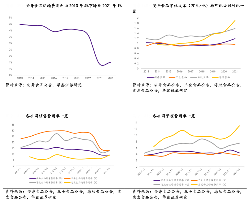 經典案例:根據安井食品公告、三全食品公告、海欣食品公告、惠發食品公司、華鑫證券研究等綜合資訊表明,安井食品公司推行“銷地產”戰略布局, 已在全國布局 11 個生產基地,通過全國化布局,能夠縮小運輸半徑,減少跨地 運輸,節約運輸費用,公司運輸費用率由 2013 年 4%下降至 2021 年 1%。