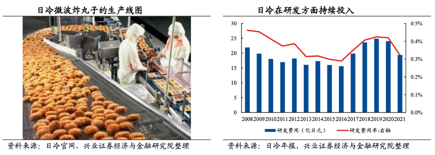 經典案例:根據日冷官網、日冷年報、興業證券經濟與金融研究院等綜合資訊表明,日冷市調后發現消費者認為鮮炸丸子味道最佳,但油炸過程繁瑣,于是公司抓住該需求痛點,技術方面突破了微波后水分的蒸發也不影響丸子酥脆口感的壁壘,于 1994 年推出微波炸牛肉丸,廣受市場好評。