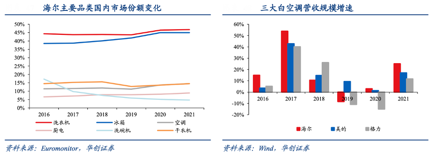經(jīng)典案例:根據(jù)Euromonitor、wind、華創(chuàng)證券等綜合資訊表明,分品類看,海爾主品牌已實現(xiàn)全品類覆蓋,大家電中冰箱/洗衣機作為公司核心品類,其國內(nèi)份額長期維持第一,2021年市占率分別達到 45.0%/46.8%,廚電品類市占率由 2016 年的 7.1%提升至 2021 年的 8.8%,空調(diào)業(yè)務近兩年在套系化協(xié)同銷售下營收增速領先。