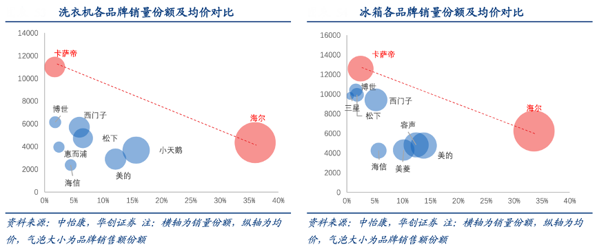 經(jīng)典案例:根據(jù)中怡康、華創(chuàng)證券等綜合資訊表明,卡薩帝與海爾主品牌已構筑出獨占盈利與規(guī)模優(yōu)勢的共贏體系。以核心品類冰箱、洗衣機為例,由海爾-卡薩帝建立的品牌組合體系構成天花板,沒有任何品牌可以在同等價格下售出更高銷量,或者在售出同級別銷量的前提下達到更高均價,這意味著海爾-卡薩帝體系在冰洗市場創(chuàng)造營收價值的能力高于任何其他品牌,獨占盈利及市場規(guī)模優(yōu)勢。