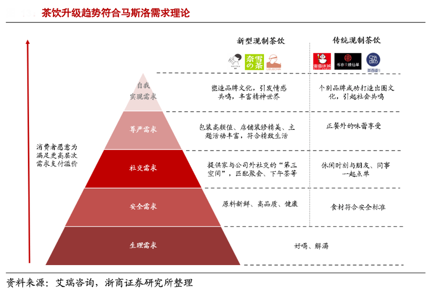 經典案例:根據艾瑞咨詢、浙商證券研究所等綜合資訊表明,在人均消費支出整體向上的趨勢下,新式茶飲作為“消費升級類”產品受宏觀經濟環境利好,消費者對茶飲的需求逐步從單一的“解渴、好喝”提升到健康化、多元化、個性化、品牌化,并愿意為實現更高層次的需求付費。