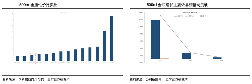經典案例:根據公司官網、五礦證券研究所等綜合資訊表明,為了迅速搶占市場,東鵬公司采用以價換量的策略在 2018 年將 250ml 金罐和 250ml 金瓶零售價分別從5元、3.5元下調至4元和3元,形成了 2/3/4/5 元的產品矩陣。