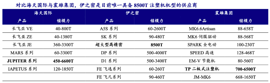 經(jīng)典案例:根據(jù)各公司官網(wǎng)、開源證券研究所等綜合資訊表明,伊之密經(jīng)過多年的技術(shù)積累以及研發(fā)投入,在2022 年推出中國首臺 8500T 超大型高精密注塑機,其額定鎖模力為 8500T,最大鎖模力可達 9000T。此產(chǎn)品實現(xiàn)了國產(chǎn)超大型兩板式注塑機關(guān)鍵技術(shù)的突破,解決了國內(nèi)超大型透明塑料件難成型的問題,能夠滿足航空航天、汽車工業(yè)、石化管道、交通設施等領(lǐng)域?qū)Τ笮椭破返男枨蟆?