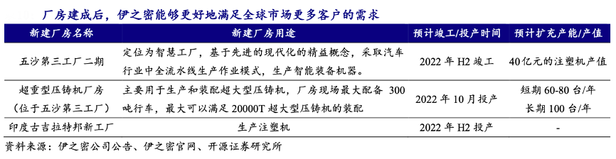經(jīng)典案例:根據(jù)伊之密公司公告、伊之密官網(wǎng)、開源證券研究所等綜合資訊表明,為應對未來日益擴大的壓鑄機與注塑機的需求,伊之密公司在壓鑄機領(lǐng)域斥資 1.6 億元,建設超重型壓鑄機廠房,在廠 房高度、跨度等規(guī)劃上都進行了加碼。在注塑機領(lǐng)域,公司設立五沙第三工廠二期,并在印度建設新工廠,進一步降低出口成本,更好地服務于注塑機業(yè)務的海外客戶。