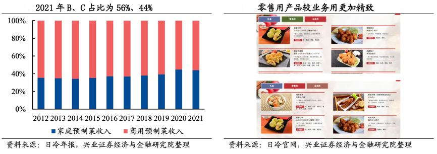 經典案例:根據日冷年報、日冷官網、興業證券經濟與金融研究院等綜合資訊表明,2021年日冷B、C端占比為56%、44%,且渠道發展也經歷了由餐飲向家庭消費的轉移。針對快餐店及便利店等商用渠道,日冷公司主推性價比的雞肉產品,針對酒店等大B,則采用高端化定制;零售渠道則強調便捷性與新鮮度,線上渠道則銷售健康食品。