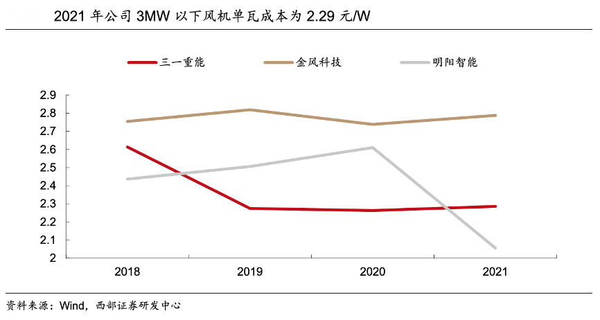 經典案例:根據wind、西部證券研發中心等綜合資訊表明,2019-2021年,三一重能 3MW 以下風機單瓦成本分別為 2.27/2.26/2.29 元/W,低于行業平均 0.39/0.41/0.14 元/W,體現了公司雙饋技術路線、葉片自制、風機輕量化設計帶來的成本優勢。