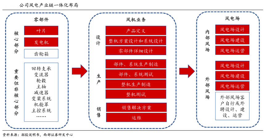 經(jīng)典案例:根據(jù)招股說明書、西部證券研發(fā)中心等綜合資訊表明,三一重能公司在風機核心零部件、風機產(chǎn)品及運維服務、風電場設計、建設、運營等方面全方位布局,具備較強的產(chǎn)業(yè)鏈一體化能力。核心零部件方面,公司具備獨立研發(fā)生產(chǎn)制造風機葉片、發(fā)電機的能力,并具備部分其他核心零部件的設計能力,同時結(jié)合智慧風場、智慧運維等技術,為客戶提供高效運維服務,有效提升風電場綜合利用小時數(shù),降低度電成本。