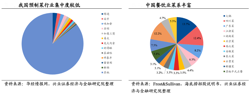 經典案例:根據企查查、興業證券經濟與金融研究院等綜合資訊表明,預制菜產業鏈集合度低。預制菜上游原材料眾多,涉及蔬果、肉制品、水產品等農產品以及調味品,中游加工企業流派眾多,同時下游兼顧 BC 渠道,細分來看,渠道結構多元化程度較高。