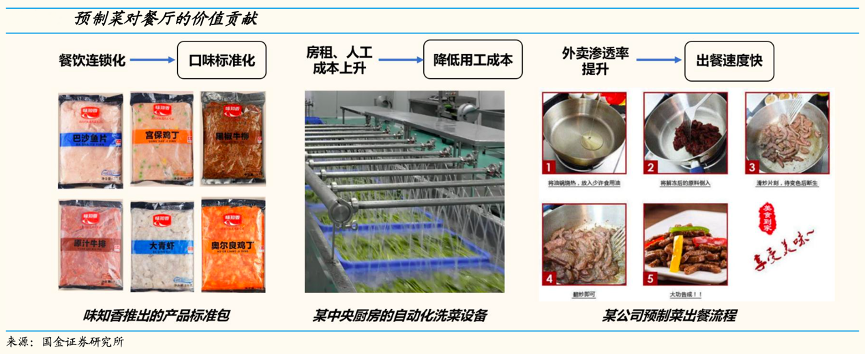 經典案例:根據國金證券研究所等綜合資訊表明,預制菜有效解決了餐飲業的難題,在降本增效的同時,提升餐企標準化程度,降低管理難度,利于復制與擴張。