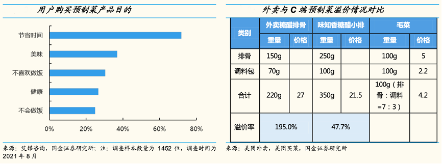 經典案例:根據艾媒咨詢、國金證券研究所等綜合資訊表明,對比外賣來說,預制菜企業在規模化、標準化生產流程下食品安全及質量相對來說有保證,外賣部分商家尤其是小作坊類,由于自身食材、廚房環境或不達安全衛生標準,容易引發食品安全問題。同時預制菜省去外賣配送過程,保證最佳口感期,并且可供選擇的 SKU 更多。