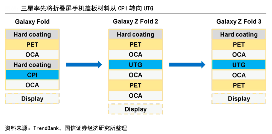 經典案例:根據TrendBank、國信證券經濟研究所等綜合資訊表明,三星在2019年推出的 Galaxy Fold 中使用了CPI 蓋板,后續在2020年推出的Galaxy Z Flip和Galaxy Z Fold 2開始使用UTG蓋板。2021年12月OPPO發 布旗下首款折疊屏手機 OPPO Find N,2022 年 4 月 vivo 發布旗下首款折疊屏手機 vivo X Fold,兩者均采用肖特供應的UTG 作為蓋板。