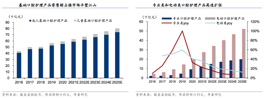 經典案例:根據薇美姿招股書、弗若斯特沙利文、華泰研究等綜合資訊表明,近些年來,得益于人們口腔健康意識的增強以及消費升級,專業口腔護理產品(主要包含漱口水、牙線棒、牙貼、口噴等)和電動口腔護理產品零售額實現高增速,在 2016 年至 2020 年 CAGR 為 44.7%和 49.5%,在 2020 年在口腔護理產品銷售額占比分別達10.4%和 22.6%,據弗若斯特沙利文預計,2025 年我國專業類和電動類產品將分別占據 20%和 52%的市場份額。