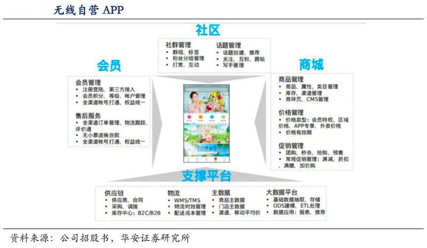 經典案例:根據公司招股書、華安證券研究所等綜合資訊表明,為實現線上線下融合,順應新零售趨勢,良品鋪子公司在已有的自營 APP 上持續優化升級,完善全渠道平臺技術系統。自營 APP 包括商城、會員、社區、支撐平臺四大版塊,打通各渠道做到精準化全域營銷,形成線上向線下門店免費 導流、線下通過掃碼使零售數據上行的線上線下互動的消費閉環,既服務現有渠道,又滿足消費者全品類、全時段、全體驗、個性化消費需求。