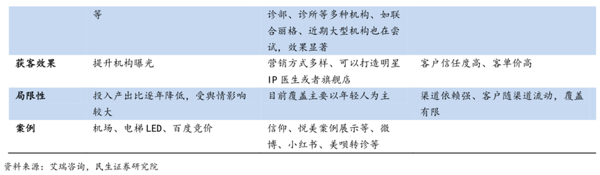 經(jīng)典案例:根據(jù)艾瑞咨詢(xún)、民生證券研究院等綜合資訊表明,電商時(shí)代來(lái)臨,醫(yī)美機(jī)構(gòu)可通過(guò)各大垂直移動(dòng)互聯(lián)網(wǎng)平臺(tái)、自媒體等多渠道營(yíng)銷(xiāo)。新氧、更美等互聯(lián)網(wǎng)醫(yī)美平臺(tái)的出現(xiàn),一方面將求美者和醫(yī)美機(jī)構(gòu)有效連接,通過(guò) PGC 端打造新媒體矩陣,全面普及醫(yī)美知識(shí),降低了信息不對(duì)稱(chēng)性;另一方面相對(duì)低廉的營(yíng)銷(xiāo)費(fèi)用望緩解醫(yī)美服務(wù)行業(yè)高營(yíng)銷(xiāo)成本的痛點(diǎn)。