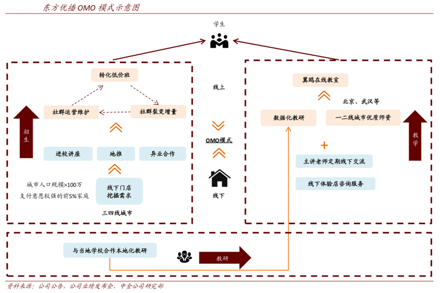 經典案例:根據公司公告、公司業績發布會、中金公司研究部等綜合資訊表明,東方優播通過地推、進校講座、異業合作等線下方式接觸當地生源,進行低成本引流,繼而通過在線低價課將線下流量導入線上。在線上社群深度運營中進行用戶篩選和維護,提高正課轉化率,同時社群裂變也可以進一步擴大增量,形成線上招生渠道的自循環。