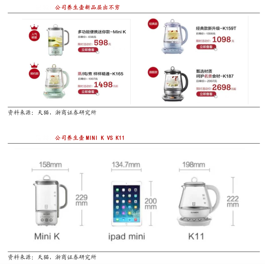 經典案例:根據天貓、浙商證券研究所等綜合資訊表明,2020 年 6 月北鼎上新了新品養生壺,相比過往養生壺產品,其一體機設計更加便攜,但容量、功率有所下調。相比于同品牌其他養生壺,新養生壺在功能細分方面有所簡化,價格也有所下調。是同品牌養生壺的一半或三分之一。但產品一經上線迅速成 為了北鼎熱銷產品,是線上店鋪銷量第一的養生壺。