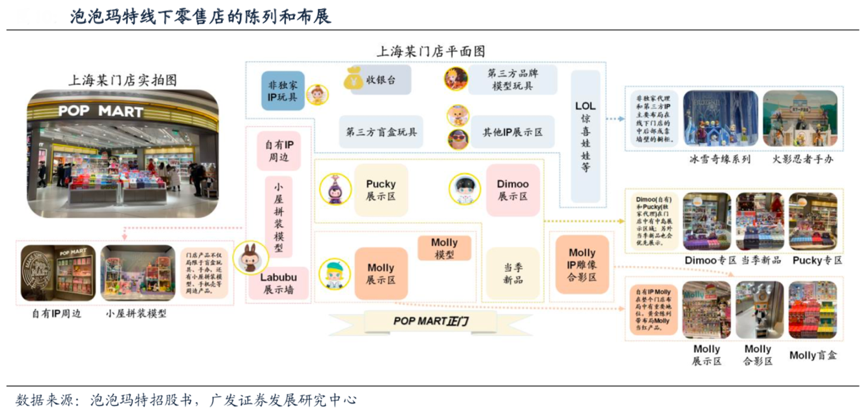 經(jīng)典案例:根據(jù)泡泡瑪特招股書、廣發(fā)證券發(fā)展研究中心等綜合資訊表明,泡泡瑪特線下實體門店裝修風(fēng)格潮流,環(huán)形設(shè)計、玩具展示墻和門口的Molly模型的共同烘托出店面的品牌感,合照區(qū)增強了與消費者的互動,快節(jié)奏的背景音樂動感旋律與潮玩文化相得益彰。泡泡瑪特的門店客服訓(xùn)練有素,對產(chǎn)品理解充分,引導(dǎo)顧客完成消費轉(zhuǎn)化。