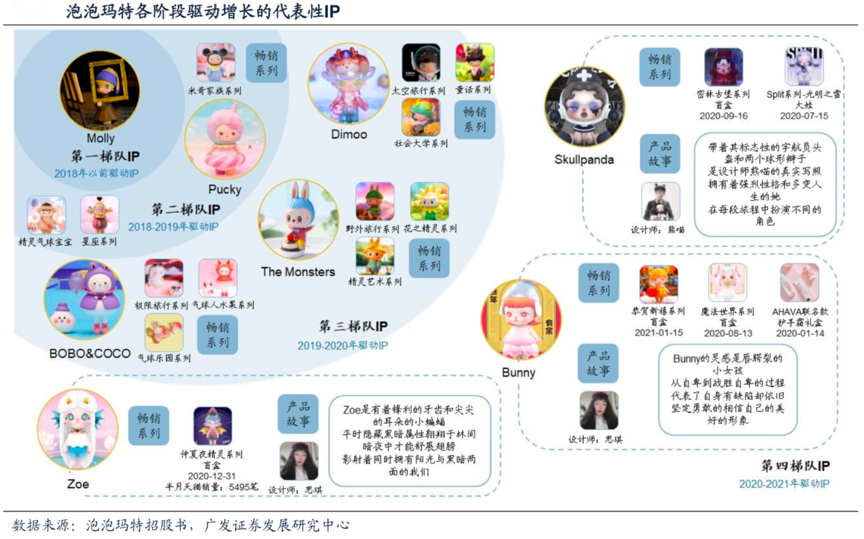 經(jīng)典案例:根據(jù)泡泡瑪特招股書、廣發(fā)證券發(fā)展研究中心等綜合資訊表明,新IP Bunny 的恭賀新禧系列于2021年1月14日24時正式發(fā)售,不到15小時天貓泡泡瑪特官方旗艦店售罄,其森林、魔法世界等系列發(fā)布后成為銷量僅次于經(jīng)典IP系列的潛力股產(chǎn)品;Skullpanda的密林古堡系列則曾于2020年10月 在預(yù)售期間,成為僅次于泡泡瑪特天貓抽盒機的第二大GMV驅(qū)動產(chǎn)品,月GMV超過 700萬元人民幣;而Zoe暗夜精靈的首款產(chǎn)品仲夏精靈夜系列,于2020年12月31日發(fā)布后的半個月內(nèi),成為天貓旗艦店銷售額排名前5的爆款產(chǎn)品,半月銷量超過5500筆。