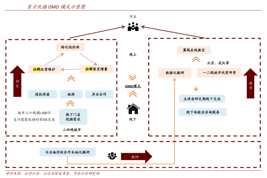經(jīng)典案例:根據(jù)公司公告、公司業(yè)績發(fā)布會(huì)及中金公司研究部等綜合資訊表明,從招生引流來看,東方優(yōu)播融合了線下低成本引流和線上低價(jià)課轉(zhuǎn)化的模式。東方優(yōu)播通過地推、進(jìn)校講座、異業(yè)合作等線下方式接觸當(dāng)?shù)厣矗M(jìn)行低成本引流,繼而通過在線低價(jià)課將線下流量導(dǎo)入線上。在線上社群深度運(yùn)營中進(jìn)行用戶篩選和維護(hù),提高正課轉(zhuǎn)化率,同時(shí)社群裂變也可以進(jìn)一步擴(kuò)大增量,形成線上招生渠道的自循環(huán)。