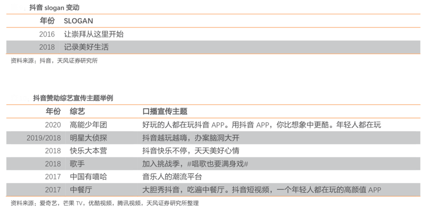 經典案例:根據愛奇藝、芒果TV、優酷視頻、天風證券研究所等綜合資訊表明,抖音 Slogan 最開始為“讓崇拜從這里開始”,主打“崇拜”和“美好”,隨著用戶不斷增 長,Slogan 轉變為“記錄美好生活”,2018 年,抖音品牌全面升級。核心圈層的影響力慢慢擴張,更多普通人的表達訴求也被激發, Slogan 升級成為“記錄美好生活”,放寬了用戶圈層和內容領域,瞄準了更大的市場,但依舊以“美好”作為抖音的宣傳主題。