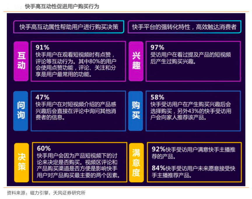 經典案例:根據磁力引擎、天風證券研究所等綜合資訊表明,結合《快手電商營銷價值報告》等數據顯示,32%的快手用戶會因為信任主播的推薦而購買 產品,12%用戶單純為支持主播而購買產品,可見快手用戶對主播信任程度高。同時,根據磁力引擎,有 60%的用戶是由于視頻網友討論決定是否購買,快手主播與粉絲的互動在直播帶貨中發揮著至關重要的作用,92%的用戶表示滿意主播推薦的商品。