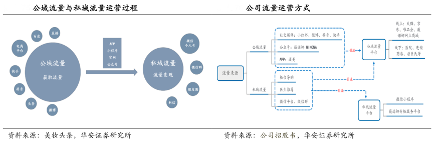 經典案例:根據美妝頭條、公司招股書、華安證券研究所等綜合資訊表明,貝泰妮公司私域流量主要是通過微信小程序和薇諾娜專柜服務平臺進行運營,微信小程序流量來源是通過在微信平臺投放廣告和短視頻獲得新客戶關注公眾號,此外公司會通過微信群進行會員維護,增強老客戶留存和復購。