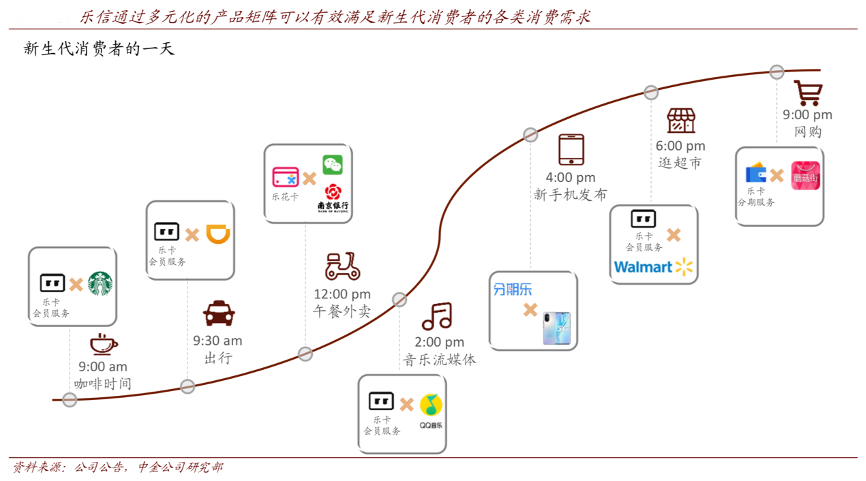 經典案例:根據公司公告、中金公司研究部等綜合資訊表明,樂信主要聚焦于 18-36 歲的優質的年輕用戶,截至2020 年末,樂信用戶的平均年齡為 25 歲,平均授信金額為 13,018 元。在樂信 1.2 億的注冊用戶中,90 后及 95 后的占比高達 73%,其用戶具有高成長性、高收入潛力、受過良好教育、高消費 需求、有建立良好信用的意愿、對用戶體驗有較強追求的特點。樂信通過多元化的產品矩陣可以有效滿足新生代消費者的各類消費需求。