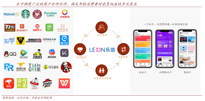 經典案例:根據公司公告、中金公司研究部等綜合資訊表明,樂卡開創以“優惠+積分+會員服務”為核心的新 消費方式,根據用戶身份、興趣、消費偏好及位置,推薦最適合其當前場景的音樂、電影、餐飲、游戲、商超、汽車加油等專屬消費權益,實現千人千面的用戶體驗。 樂卡 APP 已開拓線上線下 5000 多個品牌權益,涵蓋影音游戲、餐飲門店、會員電商、 商超購物、旅游出行、生活學習等,并加速推進“百千計劃”,對接各類線上巨頭、 線下大型連鎖機構以及社區、寫字樓周邊中小商鋪。截至 4Q20,樂卡會員產品累計 服務用戶數超 410 萬,擁有品牌權益數量超過 5,000 個。