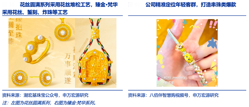 經典案例:根據潮宏基珠寶公眾號、八佰伴智慧購視頻號、申萬宏源研究等綜合資訊表明,潮宏基伴隨著黃金工藝的進步,通過古法金、硬金實現好創意,公司所積累的設計研發能力進一步賦能純金產品,例如 2024 年新品花絲圓滿系列采用花絲堆松工藝、臻金·梵 華采用花絲、鏨刻、炸珠等工藝。另外,公司精準定位年輕客群,打造串珠類爆款,并通 過小紅書等社交平臺的種草傳播成為網紅產品。